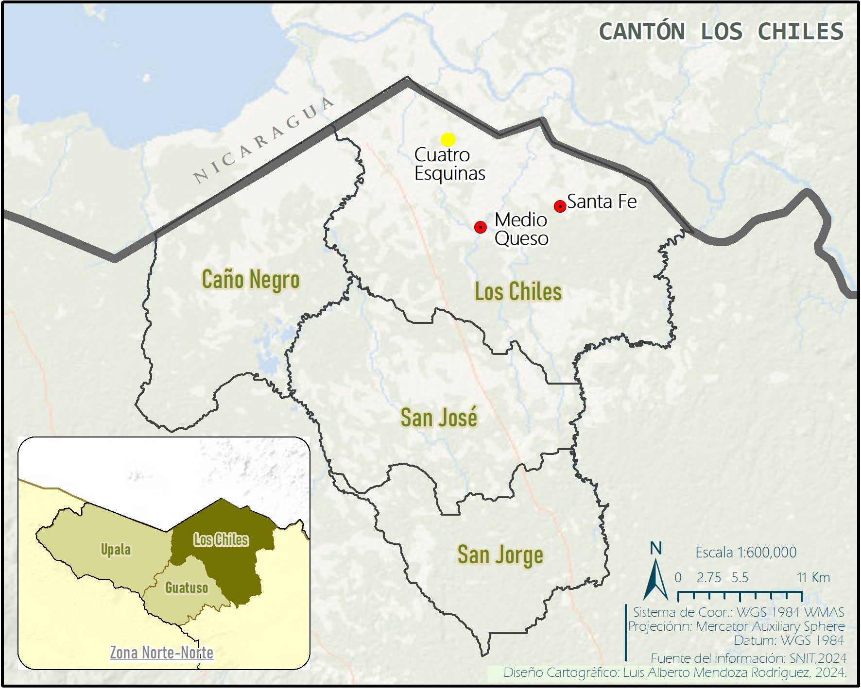 Santa Fe y Medio Queso de Los Chiles se ubican en la zona más septentrional de Costa Rica, a escasos kilómetros de la frontera norte con Nicaragua, lo que ha marcado históricamente las formas de vida e identidades de ambas comunidades. El mapa de la Figura 2 ilustra su ubicación.