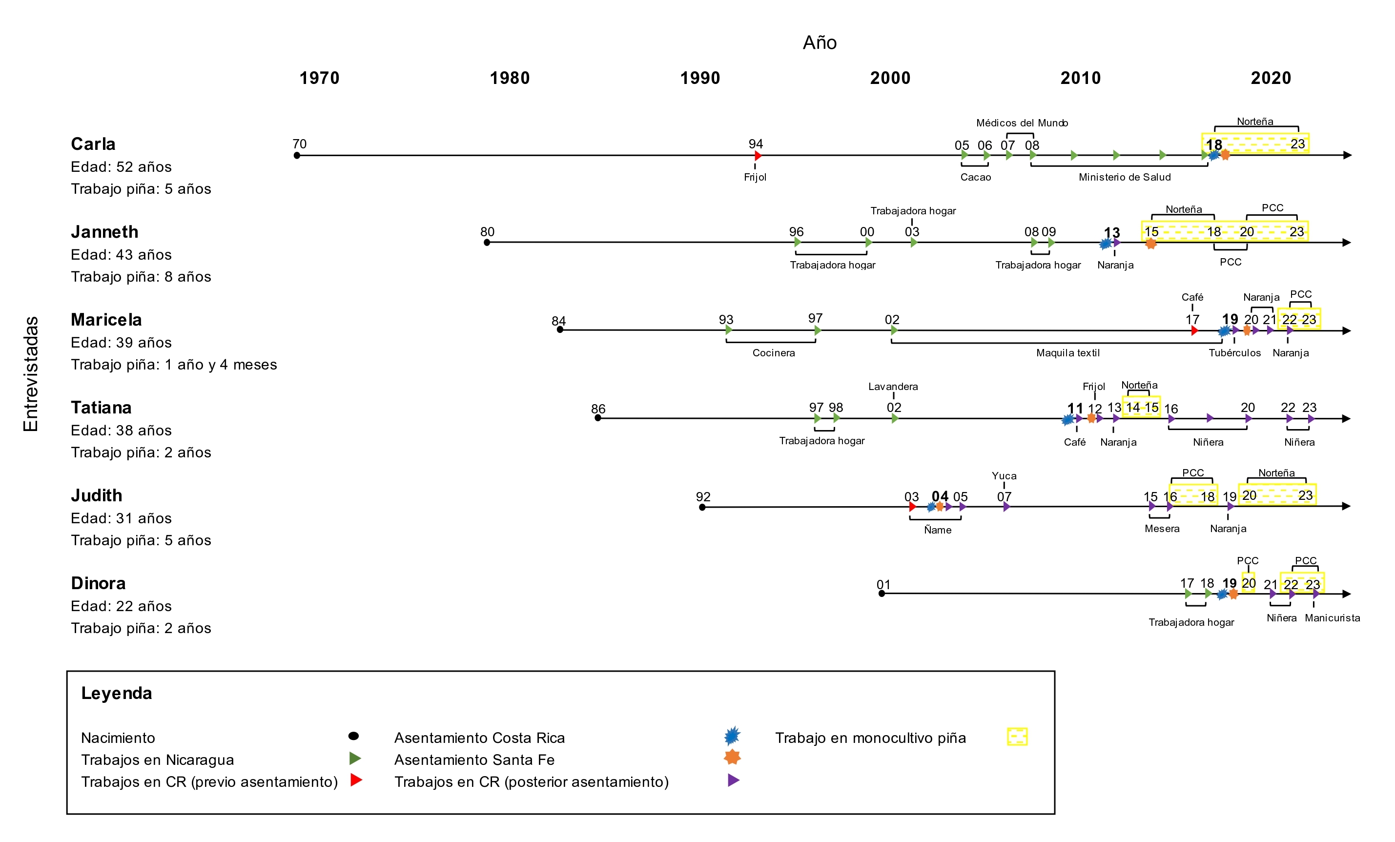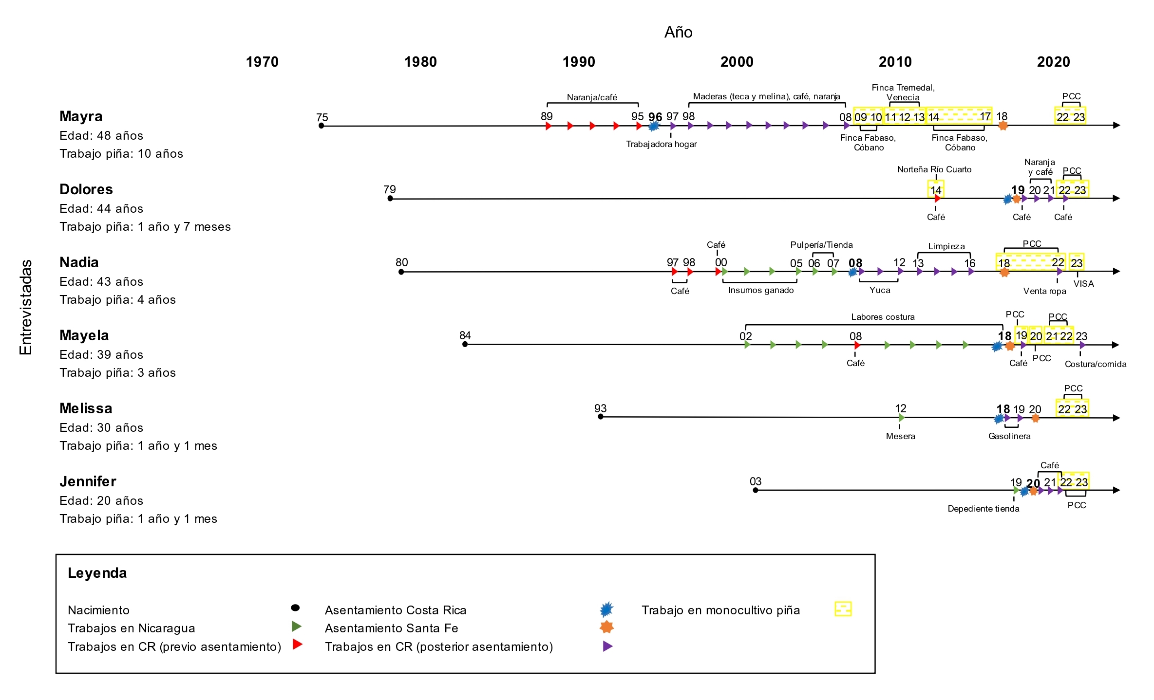 This paper focuses on the analysis of the labor trajectories of Nicaraguan women who work or have worked in the pineapple agribusiness in the Huetar Norte border region of Costa Rica. From a qualitative perspective and based on the biographical method, their work experiences in fresh fruit monoculture are analyzed within the framework of broader and more complex work trajectories that encompass their individual projects and the structural determinants that shape their course and movement. The life stories of 12 Nicaraguan women settled in the study area are reconstructed through semi-structured and in-depth interviews conducted between September and October 2023. The main finding is that their precarious condition in the pineapple farms is not only due to their mobility status, but also to their representation as otherness based on their nationality and ethnic-racial background.