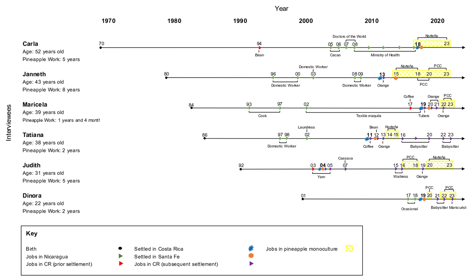 From a longitudinal perspective, this analysis provides an opportunity to focus not only on the current conditions of Nicaraguan women in the pineapple agroindustry (2023) but also on their long-term work experiences. Their work in pineapple monoculture is part of broader trajectories, so the objective of this study is to unravel the complexity of their labor trajectories by analyzing the continuities and ruptures that characterize them.