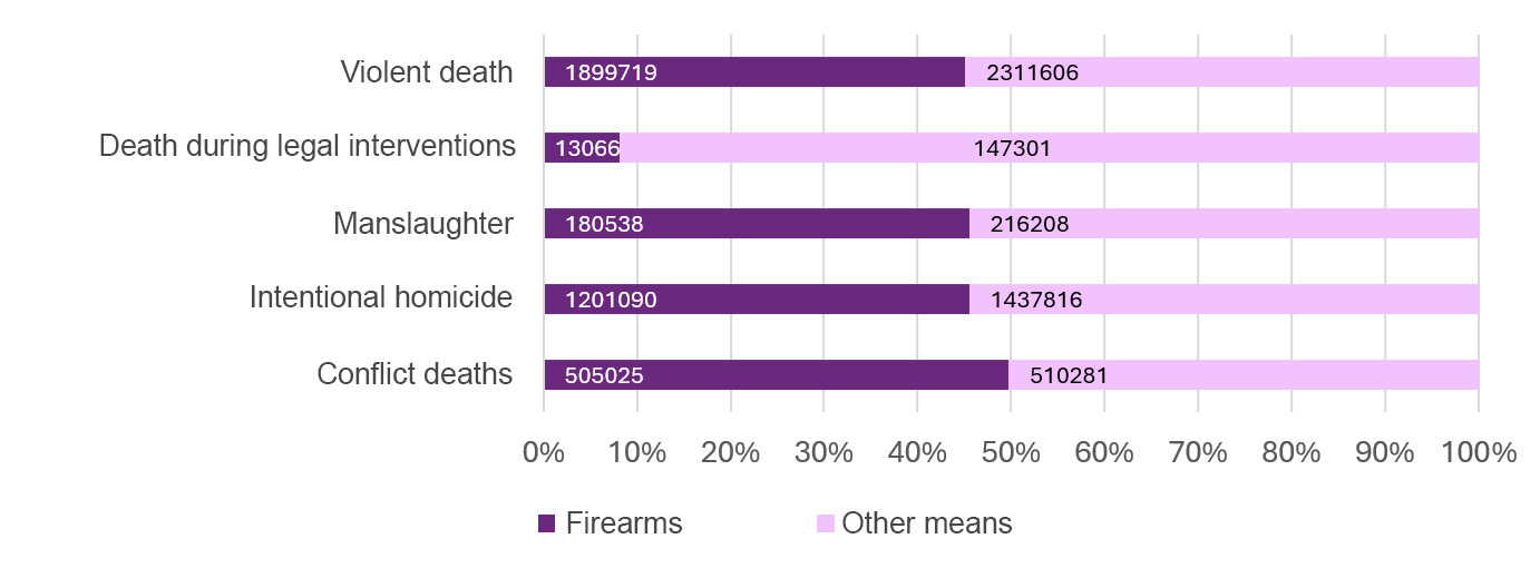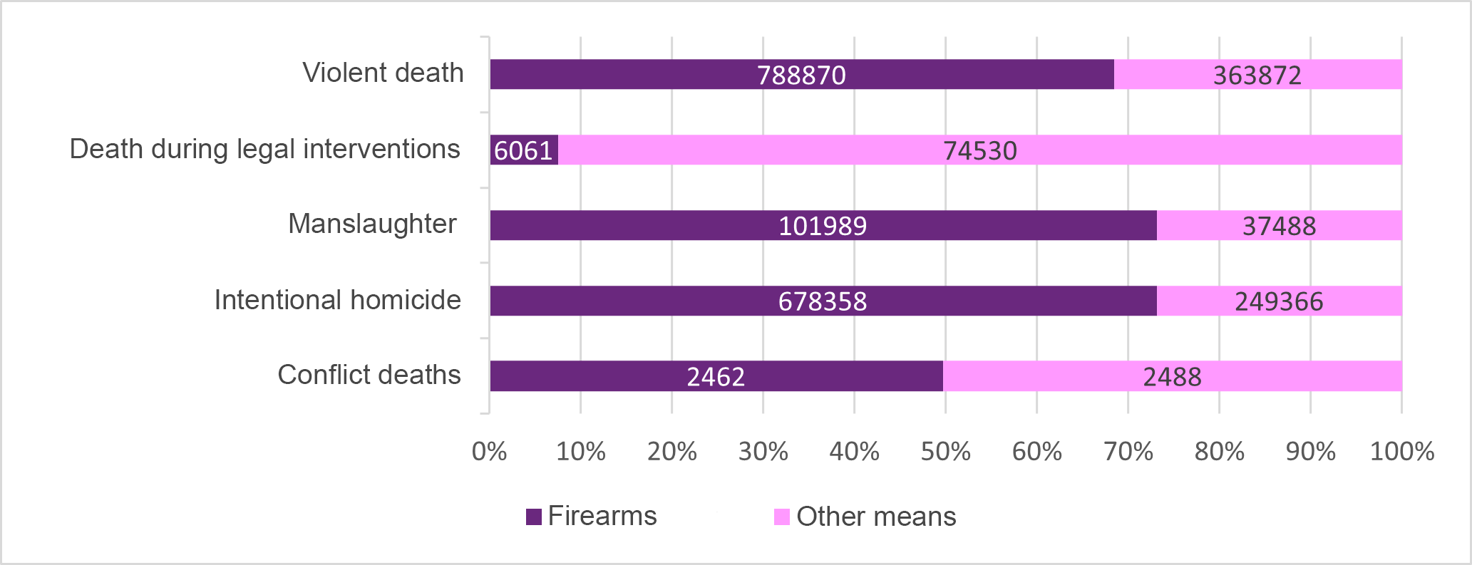 According to the 2001 Palermo Protocol, illegal arms trafficking involves the unauthorized transfer of arms between States Parties, highlighting the need to strengthen controls at source to prevent their circulation among criminal groups (Organización de las Naciones Unidas, 2001; United Nations Office on Drugs and Crime, 2020a). The legal right protected is collective security, understood as a state that enables individuals to function with confidence within a community and to exercise their individual legal rights safely under state protection against dangerous elements (Hava García, 2019). Therefore, the importance of controlling illegal arms trafficking is evident in the fact that these weapons are highly involved in homicides and violent deaths worldwide (see Figure 1).