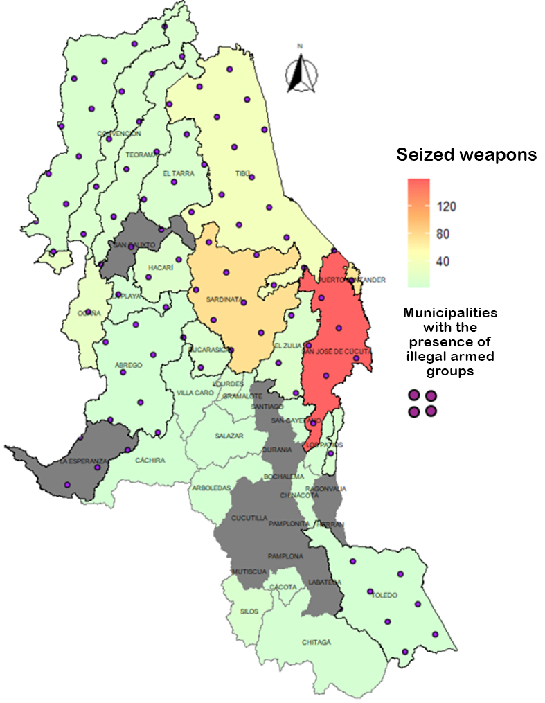 One of the conditions that has fueled illegal arms trafficking in Colombia was the departure of the Revolutionary Armed Forces of Colombia-People’s Army (FARC-EP, Spanish acronym for Fuerzas Armadas Revolucionarias de Colombia-Ejército del Pueblo) from the political-military scene, which led to a reconfiguration among guerrilla groups, paramilitary groups and criminal networks that initiated new territorial disputes (Celi Jimenez, 2020; Ibarra Cordero, 2022; Indepaz, 2023). These disputes were concentrated in regions previously affected by the armed conflict, where these organizations often surpass state authority, which conditions local communities (Lessing, 2021). The 2016 Peace Agreement led to an oversupply of illegal weapons, which, by reducing their prices, increased their accessibility in rural and urban areas. This phenomenon was exacerbated by the diversion of weapons from legal companies, the exchange of weapons for cocaine between Mexican cartels and local organizations, the high permeability of the border with Venezuela and the economic collapse of that country (Gariglio, 2023).