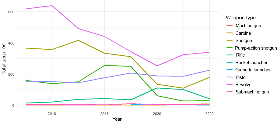 These data have some limitations. First, in terms of timing, the information provided by the entity was annualized, which prevented the analysis of possible seasonal patterns in the data. Second, as noted in the Global Study on Firearms Trafficking 2020, when seizures are taken as the main variable, the data may be somewhat inaccurate compared to cases prosecuted for arms trafficking. Nevertheless, this source was chosen because, according to the report, it is uncommon in various national regulations for individuals to be prosecuted specifically for arms trafficking, as they are more often charged with other crimes, such as illegal possession of weapons. This situation makes it difficult to obtain detailed information through judicial proceedings. Furthermore, weapons seizures represent state action against crime, but do not necessarily directly reflect the phenomenon of illicit arms trafficking. Therefore, these quantitative data provide a general approximation of the phenomenon under study, making it essential to consider the context in which the research is conducted to interpret the results accurately.