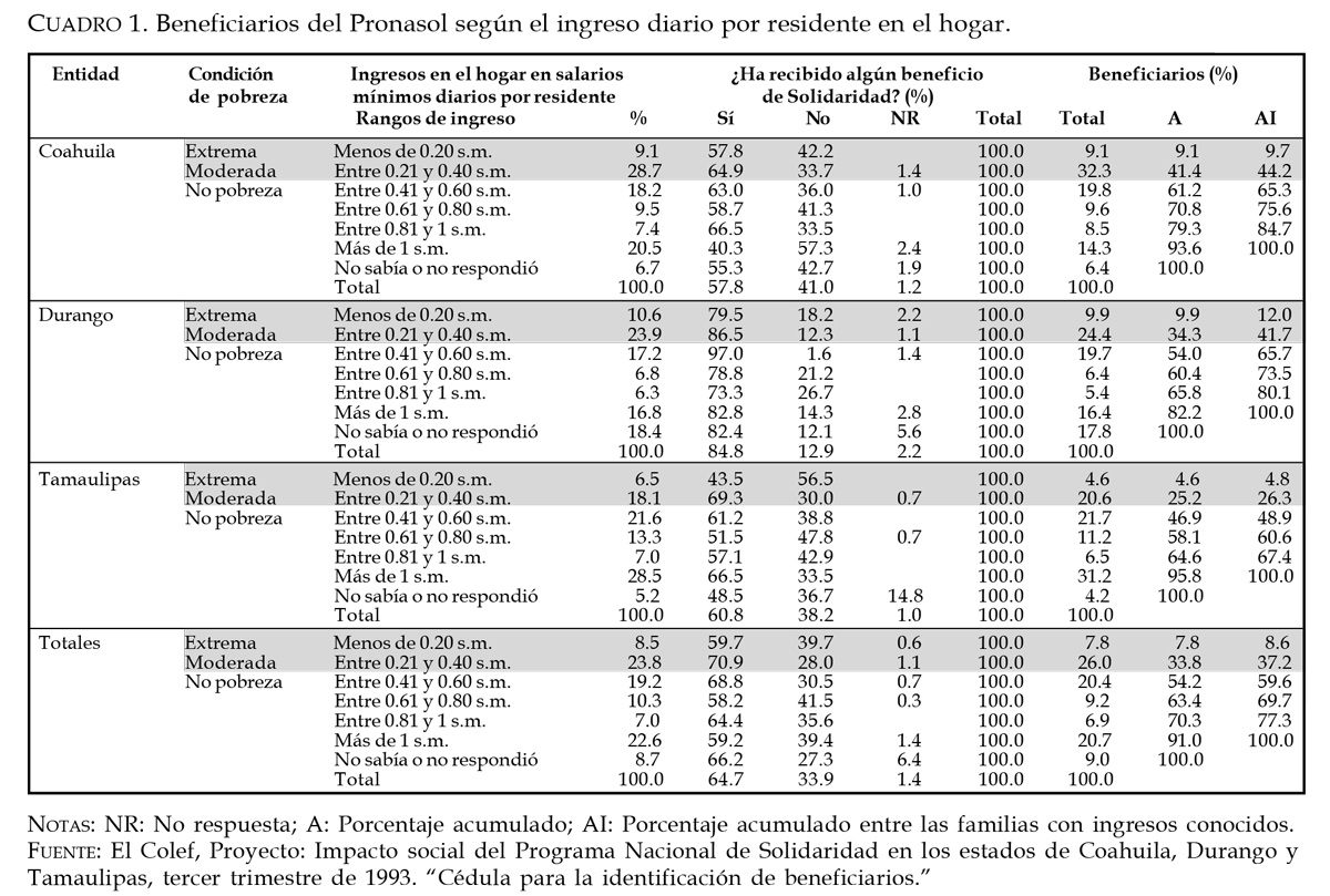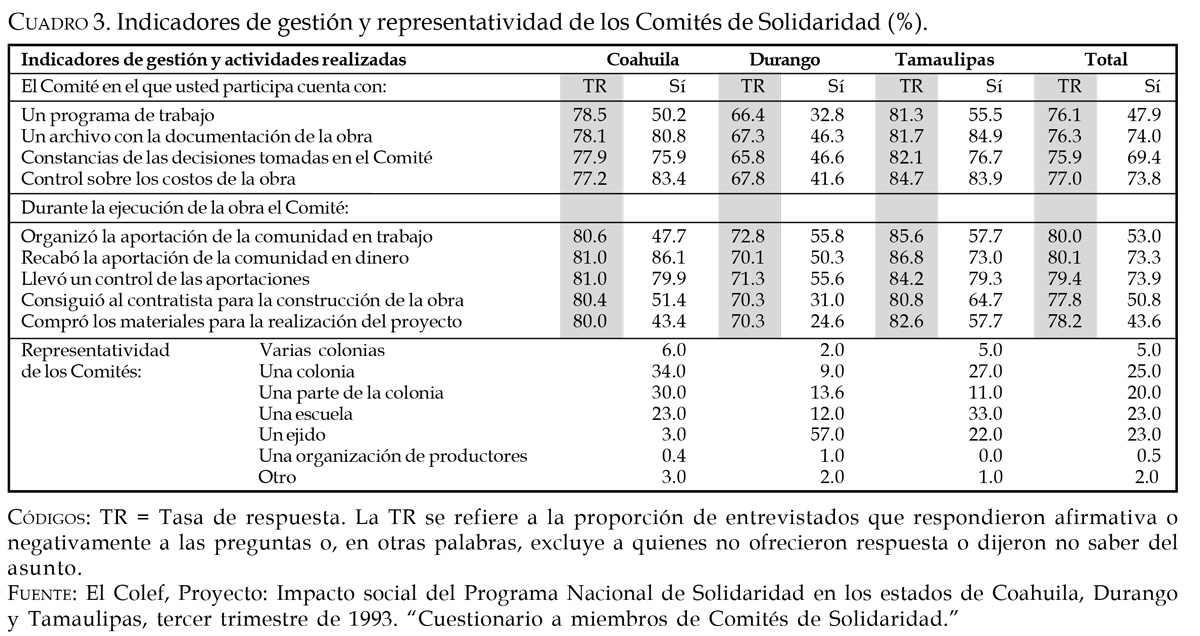 La información que sirve de base para este estudio se derivó del proyecto de investigación denominado "Impacto social del Programa Nacional de Solidaridad", que El Colegio de la Frontera Norte realizó durante el tercer trimestre de 1993 en los estados de Coahuila, Durango y Tamaulipas. Particularmente se utilizarán las bases de datos que surgieron de dos encuestas: una dirigida a beneficiarios y otra levantada entre miembros de las mesas directivas de los Comités. Para llevar a cabo el análisis, se aplicarán técnicas estadísticas simples y se presentará la información en forma comparada para identificar los cambios en el perfil y desempeño de los Comités en los tres contextos regionales investigados.