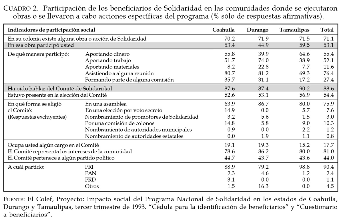 Desde un punto de vista comparativo, no obstante que en los tres casos estudiados se perfila un contexto de movilización social de importantes dimensiones, los datos revelan la presencia de diferencias significativas en los grados y tipos de participación alcanzados en cada entidad. En el extremo inferior encontramos que en la entidad de Durango, el estado económicamente más débil de los tres y en el cual el programa obtuvo un grado de error en la selección de beneficiarios menor al promedio, la proporción de población beneficiada participante fue la más baja y en su mayoría optaron por formas de colaboración basadas en aportaciones en trabajo. En el punto superior del espectro tenemos que en Tamaulipas, una entidad con una economía menos vulnerable y donde el Pronasol obtuvo el peor desempeño en la identificación de su población objetivo, los beneficiarios manifestaron los niveles más altos de participación y entre ellos la mayoría tuvo la posibilidad de financiar los proyectos con recursos monetarios, pero en contraparte se observó menos interés por asumir otras responsabilidades, como acudir a las reuniones o formar parte de alguna comisión.