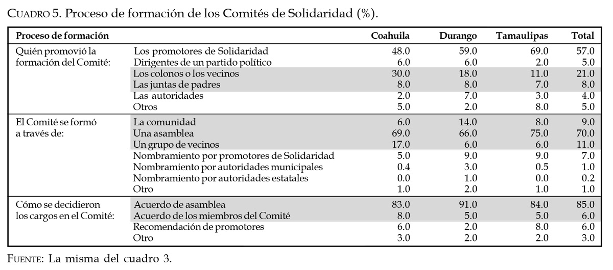 Antes de iniciar con el estudio de la dimensión política, cabe precisar que los Comités de Solidaridad se crean al amparo de la intervención pública y, en ese sentido, sus características dependen en gran medida de la actuación de los intermediarios del programa en los procesos de selección. Si bien la formación de un Comité se podía dar sólo por iniciativa de los miembros de una comunidad, en cualquier caso al final todos debían ser reconocidos (o validados) por el Delegado del Programa o uno de sus representantes (Consejo Consultivo, 1994:65). Además de esta prerrogativa, los datos (cuadro 5) demuestran que muy pocos tuvieron su origen en las propias comunidades (29%); en general, más de la mitad de ellos (57%) se constituyeron por la acción directa de los Promotores de Solidaridad. Aunque la capacidad de intermediación de los responsables regionales del Pronasol en teoría no debía generar distorsiones en la identificación de la población objetivo, en la práctica la inexistencia de criterios rigurosos para la selección les otorgó facultades de facto para canalizar a sectores sociales no prioritarios. Por lo que ya sabemos, los errores de selección cometidos en las entidades estudiadas se ubicaron, según los niveles de ingreso familiar, entre 58 y 73% del total de beneficiarios y que en el peor de los casos (en Tamaulipas) los intermediarios directos del programa tuvieron una mayor presencia como promotores de la organización vecinal. Con estos resultados sólo quedarían por despejar algunas dudas sobre si tales desaciertos tuvieron su origen en motivaciones políticas no legítimas o contrarias a los procesos de democratización.
