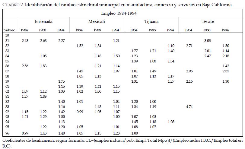 En cuanto al crecimiento del empleo en los municipios de Ensenada y Tecate, la situación es la siguiente: en Ensenada se presenta un proceso de maduración y lenta expansión del empleo, en tanto que en Tecate el crecimiento de las actividades se da de manera rápida, así como el aumento en el número de empleos. Si bien ambos municipios están muy ligados al desarrollo de Tijuana y la región de san Diego, California, Estados Unidos, manifiestan una estrategia territorial diferente: Tecate es contiguo y con tendencia a conurbarse con Tijuana, mientras que Ensenada tiende a convertirse en un espacio de equilibrio de una extensa región metropolitana que comienza a conformarse en la costa del Pacífico. La distribución territorial y su especialización intrarregional, tratamos de identificarla por medio de un análisis estructural de los niveles de especialización de cada uno de los subsectores de actividad en el ámbito municipal para el periodo 19841994 (ver cuadro 2).