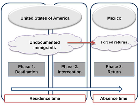 This study contains information regarding three phases of migration based on the trajectory related by the informants: destination, interception and return. The first phase involves the analysis of structural and individual factors that influenced exercising the right to health during the time spent in the United States. The second phase focuses on investigating how the right to health was experienced in scenarios of interception or immigration control identified specifically in forced return during situations of detention. The final phase refers to the recent return to the country of origin, which entails both the impact to health during the previous migration phases and perceptions of structural conditions (public programs and health services) designed to assist the Mexican population returning involuntarily (Zimmerman et al., 2011) (See Figure 1).